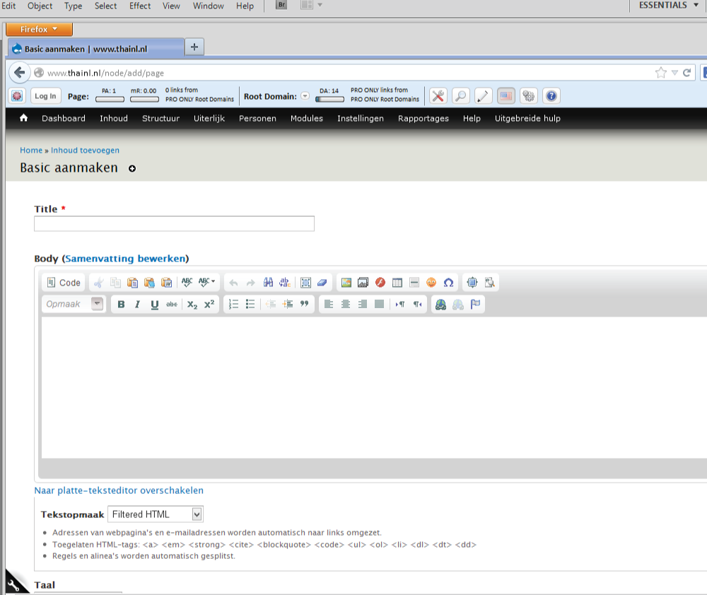 Onder de editor is een keuze mogelijk voor ‘Filtered HTML’ (beperkte opmaak mogelijkheden) of ‘Full HTML’ (volledige opmaak mogelijkheden inclusief het plaatsen van o.a. afbeeldingen).