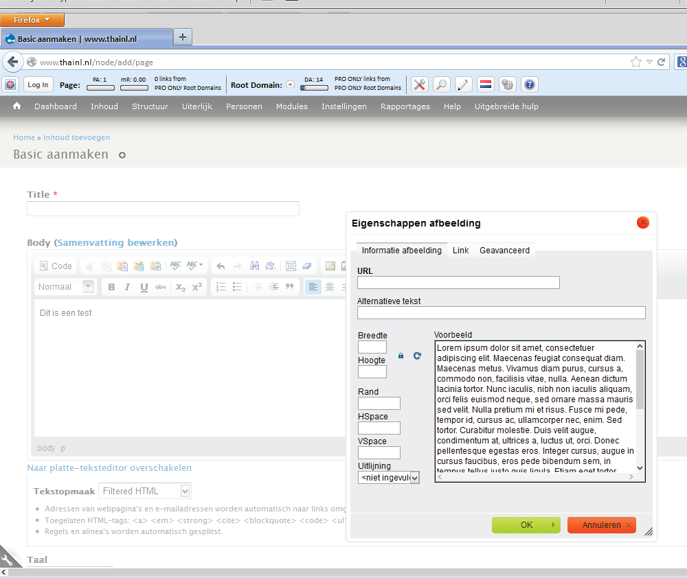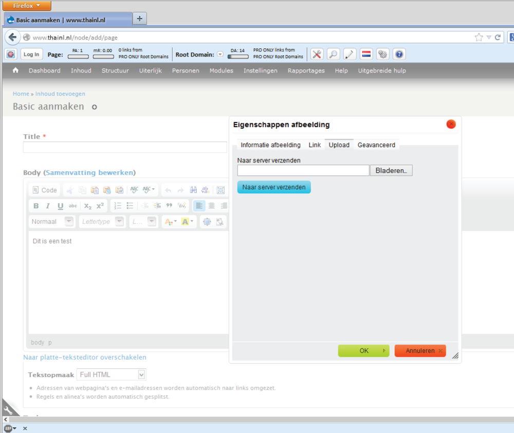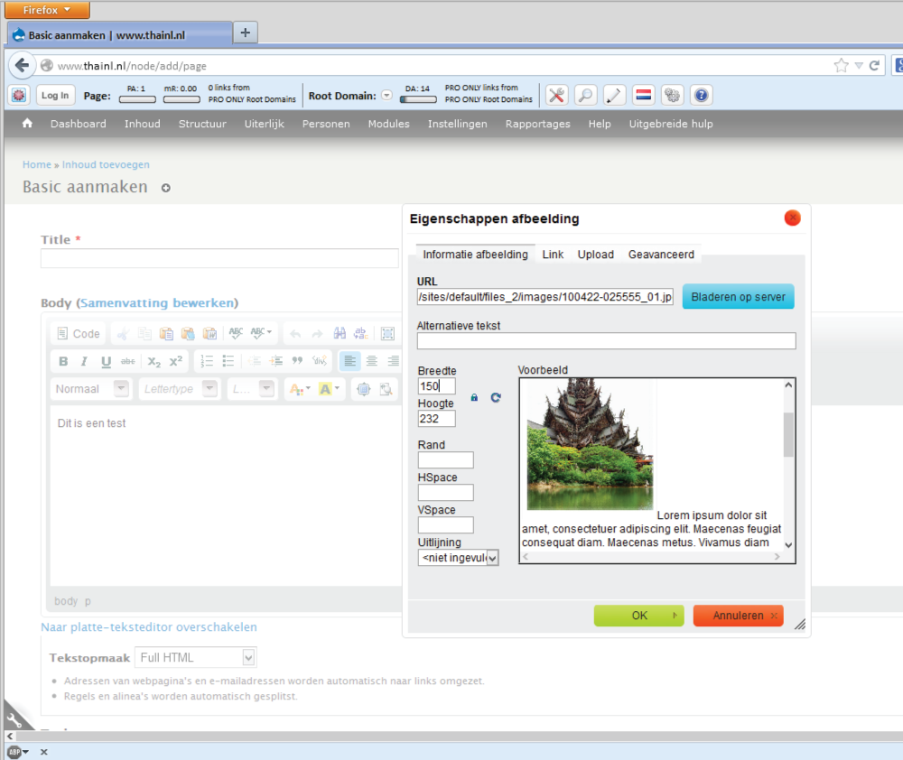 De opmaak mogelijkheden van de editor gaan zeer ver bij gebruik van Full HTML. De meeste knoppen spreken voor zich. Om een afbeelding te plaatsen klik op de afbeelding icoon. Er opent een nieuw scherm met een voorbeeld tekst en mogelijkheden om de afbeelding van de server te halen, de afmetingen van de afbeelding en positie van de afbeelding aan te geven. Aan de bovenkant van dit scherm zijn tabbladen. Om een nieuwe afbeelding te uploaden klik op ‘upload’. Hier kan je de afbeelding op je PC zoeken door naar de gewenste directory te gaan. Nadat de afbeelding is geselecteerd klik ‘naar server zenden’. Als dit gedaan is komt het eerste scherm weer naar voren en is de afbeelding te zien in het voorbeeld kader. Je kan nu de grootte van de afbeelding wijzigen door de hoogte een breedte in te geven. Eventueel nog ruimte om de afbeelding worden ingesteld door ‘Rand, Hspace, Vspace’ in te stellen (dit is in pixels). De positie van de afbeelding kan worden aangegeven b.v. geheel links of geheel rechts van de pagina (met omloop).